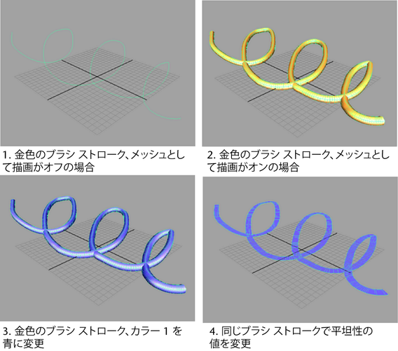 strokeShape ノードにはペイント エフェクト(Paint Effects)使用中に設定できるアトリビュートがあります。