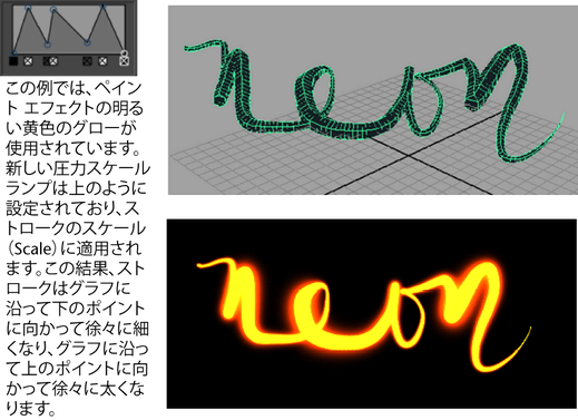 このグラフを使用して、(他の圧力制御アトリビュート同様に)ストロークに沿って線幅を編集します。このグラフは、ストロークを徐々に細くし、「スケッチしたような」外観を持たせるときに効果を発揮します。