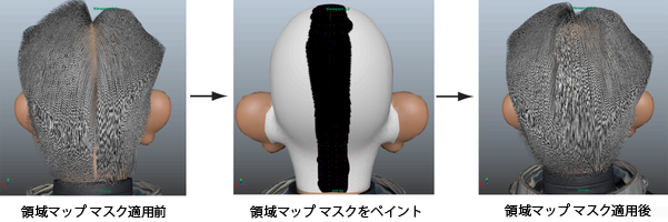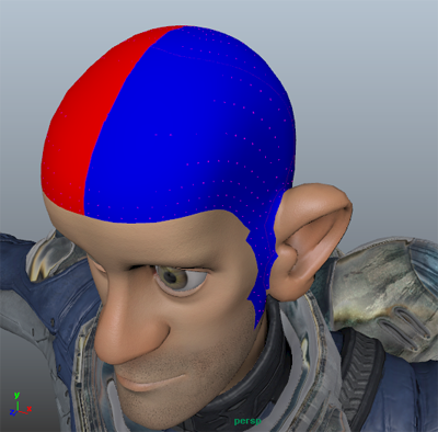 キャラクタのヘアに分け目を作成するために、Ptex ベースの領域マップを作成することができます。領域マップでは、ガイドがヘアの配置や動作を補間する方法を変更することができます。頭皮の中心に沿って髪の分け目を作成するには、頭皮の各側面(マップの 2 つの領域を定義します)を異なる 2 つのカラーでペイントします。このマップでは、カラーでペイントされた領域をスプラインが交差しないようになります。これにより、スプラインは髪の分け目を作成するペイントされた領域のいずれかの側に強制適用されます。