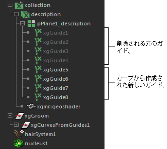 Maya はダイナミック カーブを新しいガイドに変換し、元のガイドを非表示にします。この新しいガイドは、カーブのダイナミック プロパティを継承します。