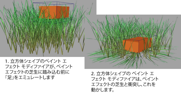 次の一連のイメージでは、ペイント エフェクト(Paint Effects)で作った芝生に踏み込んだ足をシミュレートするために、フォースを及ぼす立方体シェイプのペイント エフェクト(Paint Effects)モディファイアがキーフレーム化されています。シーン内のモディファイアの場所とフォースを及ぼす場所をより簡単に確認できるように、オレンジの立方体がモディファイアにペアレント化されます。