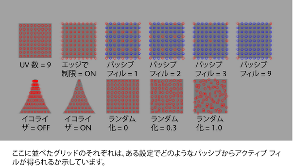パッシブ フィル(Passive Fill)アトリビュートは、既定ではアクティブ : パッシブに設定されている毛根の割合を定義します。パッシブ フィル(Passive Fill)が 1 の場合、毛根の行と列は 1 つおきにパッシブになります(これらの行や列に入っていない点はダイナミックになります)。2 の場合、ダイナミックな点を含む行 1 つに対しパッシブな行と列が 2 つずつ作られます。パッシブ フィル(Passive Fill)の値が増えると、ダイナミックなヘアの数は飛躍的に小さくなります。ヘアのモーションが比較的均一な場合、パッシブ ヘアの割合が高くても違いに気がつかないかもしれません。ただし、パッシブ フィル(Passive Fill)はアクティブ ヘアの間で均一に補間されます。これによりヘア全体が均一になり、自己衝突 (Self Collide)は必要ありません。