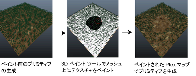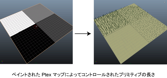 プリミティブの場所と密度を指定し、いくつかのプリミティブのアトリビュートをコントロールするために、XGen ディスクリプション付きの Ptex ファイルを使用できます。Ptex ファイルは、マップとしてポリゴン メッシュ上にオーバーレイされます。Maya の Ptex ペイントを使うか、Autodesk Mudbox 2012 (またはそれ以降)で作成された Ptex ファイルを使用して、Ptex マップを作成することができます。Maya では、XGen で保存されたときに Ptex ファイルを生成するテクスチャをペイントするために、Paint 3D ツールを使用することができます。