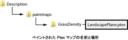 Maya で Ptex マップを作成する場合は、指定するマップ名(Map Name)が、Ptex ファイルを格納するフォルダ名に割り当てられます。Ptex ファイル名は、ペイントするポリゴン メッシュ オブジェクトから派生します。Maya では、ディスクリプションのディレクトリに含まれる paintmaps フォルダに Ptex フォルダとファイルが格納されます。たとえば、LandscapePlane という名前のポリゴン メッシュ上の GrassDensity という名前のマップをペイントした場合は、フォルダとファイルの構造として次のように表示されます。