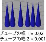 これらのアトリビュートでは、チューブの付け根の幅(チューブの幅 1)と先端部の幅(チューブの幅 2)を指定します。チューブの中間部分の幅は、これら 2 つの値の間でリニアに変化します。