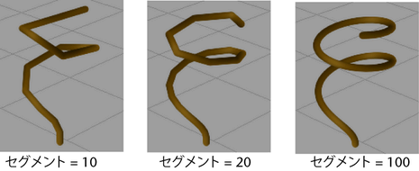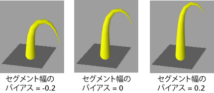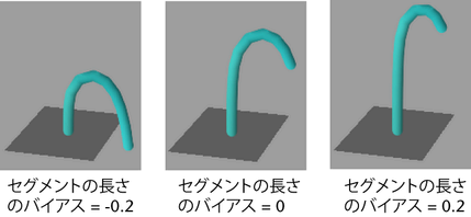 長さの異なるセグメントをどのように分布させるかを定義します。セグメントの長さのバイアス(Segment Length Bias)を 0 に設定すると、すべてのセグメントが同じ長さになります。正の値を指定すると、チューブの付け根に近いセグメントが長くなります。負の値を指定すると、チューブの先端部に近いセグメントが長くなります。セグメントの長さのバイアスの絶対値は、長いセグメントの割合を示します。