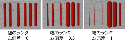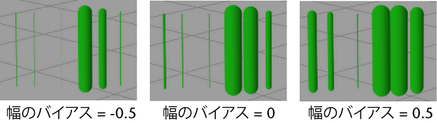 このアトリビュートが使用されるのは、幅のランダム偏差(Width Rand)が 0 より大きい値に設定されている場合に限られます。これは、ランダムに変化する幅をどのように分布させるかを定義します。幅のバイアス(Width Bias)を 0 に設定すると、太いチューブの数と細いチューブの数が同じになります。正の値を指定すると、太いチューブのほうが細いチューブよりも多くなります。負の値を指定すると、細いチューブのほうが太いチューブよりも多くなります。植物をレンダーする場合は、通常、負の値を指定するとリアルな効果が得られます (一般的に、太い草木の周囲には複数の細い草木があります)。