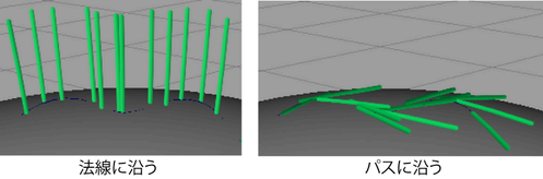 サーフェス法線またはストローク用に定義された法線に沿ってチューブを作成します。「strokeShape ノード」の「法線方向(Normal Direction)」セクションにある「法線の使用(Use Normal)」を参照してください。