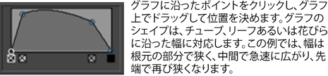 この設定は、2 値間の単純なリニア補間ではなく、グラフを使用して根元からチューブの先端までの幅をコントロールすることを可能にします。ブラシ タイプ(Brush Type)のメッシュ(Mesh)と共に使用すると、チューブのプロファイルを制御することができるのと同様に、球のようにシェイプを定義することができます。前のプリセットが動作するように、幅のスケール(Width Scale)は現在の幅のスケールとして適用され、既定値は 1.0 になっています。