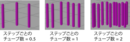 成長シミュレーションの各ステップで(ストロークのパスに沿って新しいポイントがサンプリングされるたびに)新たに植え付けられるチューブの数を指定します。最後にサンプリングされたポイントと最新のポイント間のパス(セグメント)に沿って新しいチューブが植え付けられ、以前に植え付けられたチューブが 1 つのセグメント分だけ成長します。