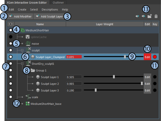 ディスクリプションで各インタラクティブ グルーミング モディファイアを表します。モディファイアを選択し、そのアトリビュートを編集してスカルプト レイヤを追加します(スカルプト モディファイアのみ)。モディファイアをドラッグ アンド ドロップするか、または / アイコンを使用して、モディファイア スタック内の順序を変更すると、モディファイアのグルーミングへの全体的な影響が変更されます。