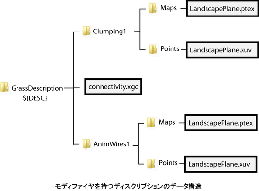 XGen は同じデータ構造を、束(Clumping)のモディファイアによって作成された束マップなど、XGen モディファイアによって生成された Ptex マップに使用します。たとえば、束(Clumping)モディファイアと AnimWire モディファイアを GrassDescription ディスクリプションに追加していた場合、Maya が次の既定のデータ構造を生成します。