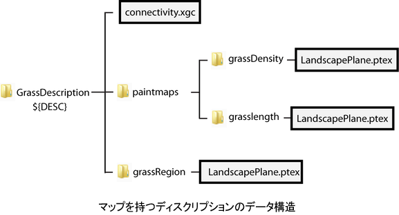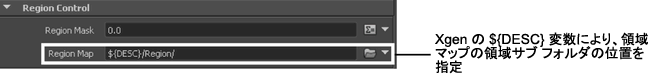 プリミティブをコントロールするためにマスク(Mask)または領域マップ(Region Map)など、アトリビュートの Ptex マップをペイントする場合、Maya がこれらの Ptex ファイルに対してディスクリプション内にサブフォルダを作成します。マップをディスクリプションと接続するデータ パスが XGen 変数 ${DESC} で指定されます。これにより確実に Ptex ファイルすべてがディスクリプションによって正しくソースになります。