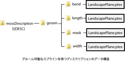 グルーム可能なスプラインのディスクリプション(たとえば MossDescription と呼ばれるもの)には、グルーミング(Grooming)ブラシによって変更されたアトリビュートに対し、Ptex ファイルが作成されます。Maya は次の既定のデータ構造を生成します。