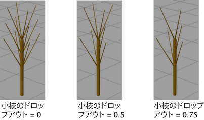 より自然な外観を実現するために、ランダムに剪定される小枝の比率を指定します。小枝のドロップアウト(Twig Dropout)が 0 である場合は、クラスタ内の小枝数で指定された数の小枝が各クラスタ内でそのまま作成されます。小枝のドロップアウト(Twig Dropout)が 1 である場合は、すべての小枝が剪定されます。