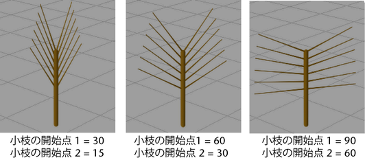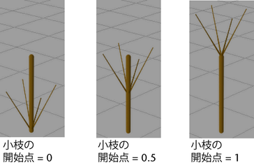 チューブ上で小枝が最初に現れる位置を指定します。たとえば、小枝の開始点(Twig Start)を 0.5 に設定すると、セグメント単位で測ってチューブの中間の位置に小枝が現れます。このアトリビュート値を小さくすると、小枝の開始位置がチューブの付け根の方に移動します。