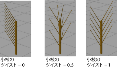 元の大枝の回りで小枝クラスタをどの程度ねじるかを指定します。0 を指定すると、すべての小枝クラスタが大枝に沿って直線上に並びます。正または負の値を指定すると、元の大枝の上で回転した(ねじれた)位置に後続の小枝クラスタが配置されます。