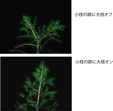 このチェック ボックスをオンにすると、大枝から小枝を生やす代わりに、小枝から大枝を生やすことができます。小枝の後に大枝(Branch After Twigs)をオンにした場合、主幹に沿って小枝が均一に配置され、小枝の後に大枝が分岐します。大枝(Branches)アトリビュートで定義された分岐は、小枝の上で起こります。これは松をはじめとする多くの標準的な木のシェイプを定義する際に便利な設定です。主幹から何本もの大枝を分岐させることができます。また、小枝の幅のスケール(Twig Length Scale)を使用して樹木全体のプロファイルを調整することもできます。これは、小枝の開始ポイントから、主幹に沿って小枝と大枝の密度を制御します。短い小枝は、枝分かれとセグメントが少なくなるように調整されます。