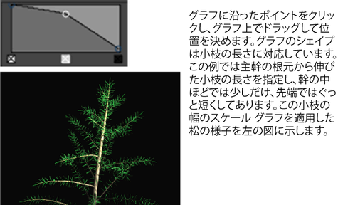 小枝の基本の長さは小枝の長さ(Twig Length)アトリビュートで定義されます。しかし、樹冠近くの小枝を根元寄りの小枝よりも短くするケースもあるでしょう。小枝の幅のスケール(Twig Length Scale) アトリビュートを使って小枝の長さ(Twig Length)をスケールすることができます。このアトリビュートを 1.0 に設定すると、小枝の長さはアトリビュート「小枝の長さ」と同じ値になり、0.5 をセットすると小枝の長さの半分の値になります。グラフの水平の次元は、小枝が分岐しているチューブの根元から先端までの位置に対応しています。