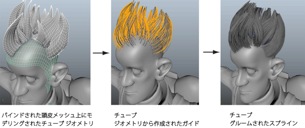 チューブ状のポリゴン メッシュを使用して、既定のスプライン ヘア グルームの形状を定義します。XGen は、モデリングされたチューブ オブジェクトの形状からガイドを生成します。