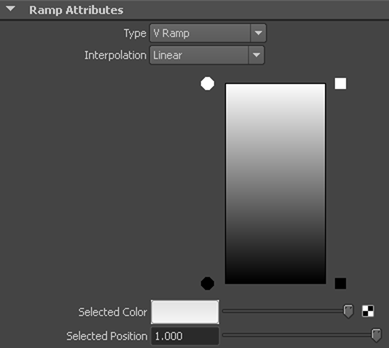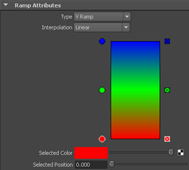 - アトリビュート エディタ(Attribute Editor)のランプ アトリビュート(Ramp Attributes)セクションで、カラー ランプの左上にある小さな青い円を選択します。選択したカラー(Selected Color)の隣にあるカラー ボックスが変更されます。