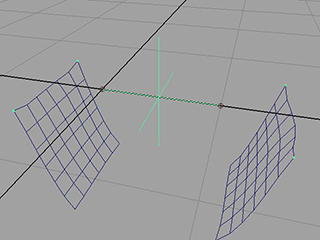 両方の nCloth のエッジが互いに重なり合っているため、両方のプレーンの頂点をすべて選択するのが難しいかもしれません。これをやりやすくするには、プレーン同士をわずかに離してから頂点を選択します。これを行う場合、例を続行する前にプレーンを必ずオリジナルの位置に戻すようにしてください。
