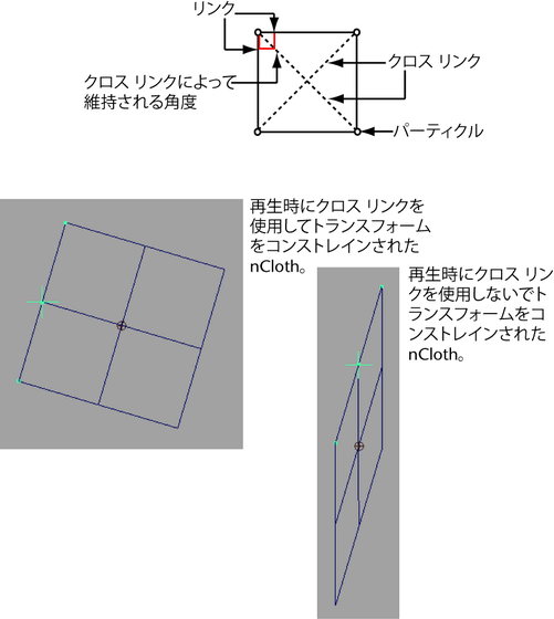 nCloth は、多数のリンクに接続された多数のパーティクル ネットワークから構成されており、ともにダイナミック メッシュを作成します。このネットワークには、さらに密接にパーティクルに接続するクロス リンクもあります。リンクがパーティクル間の距離を維持し、クロス リンクがリンク間の角度を維持することで nCloth は安定化され、シアなどのクロス動作は回避されます。
