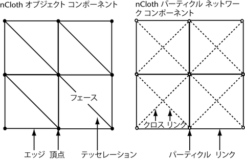 nCloth のパーティクル ネットワーク内のコンポーネントは、そのオブジェクト コンポーネントに直接対応します。nCloth の頂点ごとにパーティクルがあり、エッジごとにリンクがあり、フェースごとに 2 つのクロス リンクがあります。1 つは四角形分割(テッセレーション)に配置され、もう 1 つは四角形分割に垂直に配置されます。
