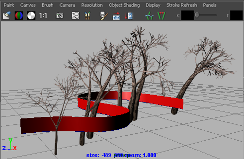 次の例では、単一のチューブ付きストロークによって複数の木をペイントしていますが、個々の木は 3D 空間内で別々に定義されています。リボンは木々の間を縫って作成したサーフェスです。ペイント エフェクト(Paint Effects)のストロークは 3D 空間に存在するので、このような操作が可能になります。