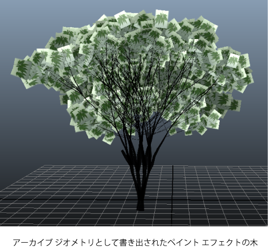 このセクションでは、Maya のペイント エフェクト ツリーがカスタム アーカイブ ジオメトリに変換され、シーンに追加されます。