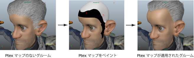 Ptex ベースのマップを作成すると、ヘアまたはファーを表示しないキャラクタ メッシュの領域をマスクすることができます。次の例に従って、Ptex ベースのマスクを作成し、部分的にグルームされたキャラクタのヘアラインを定義します。ヘアのない部分を作成する場合にも、同じ手法を使用できます。