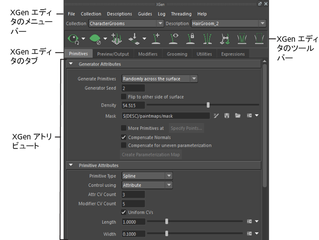 XGen のコレクションやディスクリプションを作成および編集するときは、主にこの XGen エディタ(XGen Editor)から行います。このエディタにはプリミティブを作成、修正、およびコントロールするオプションがあります。たとえば、アトリビュート、プレビューとレンダーの設定、グルーミング ブラシ、モディファイアなどです。モデリング(Modeling)メニュー セットから XGen エディタ(XGen Editor) > 生成(Generate)を選択して XGen エディタ(XGen Editor)にアクセスします。