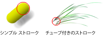 ペイント エフェクト(Paint Effects)キャンバスを表示すると、ペイント エフェクト ツールが自動的に選択されます。ペイント エフェクト ツールのカーソルの大きさは、ストロークのパス(ブラシ)の幅を表します。シンプル ストロークの場合、カーソルの直径がペイント スタンプの幅を定義しています。チューブ付きのストロークの場合は、ブラシの幅によってストロークのパスの境界が定義されます(この境界の内部だけがチューブの成長の開始ポイントになります)。