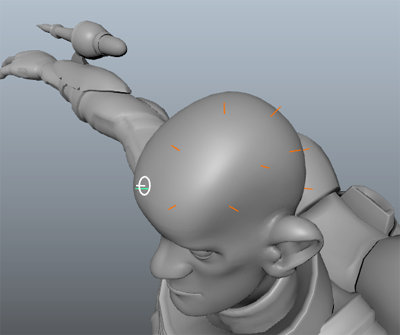 - Maya ツールボックスで、スケール(Scale)ツールを選択し、ガイドをスケールしてヘアの長さを設定します。