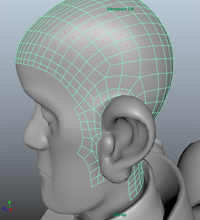 ヒント: ガイドベースのワークフローを使用する場合は、キャラクタ頭部の頭皮領域のみを定義するポリゴン メッシュにスプラインを追加してください。この操作を行うと、メッシュのどの領域にカーブを設定するのかをより細かくコントロールできます。