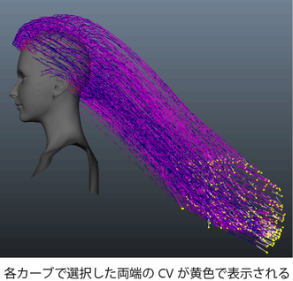 nHair のスタイリングを行う場合は、nConstraint を適用するカーブ CV グループを選択しなければならないことがよくあります。たとえば、ヘア カーブを配置するために、トランスフォーム(Transform) コンストレイントの各カーブ上の終端の CV を選択する必要が生じます。選択できるコンポーネントは、ヘア システムの現在のディスプレイによって異なることに注意してください。ディスプレイをカーブの現在位置に設定するには、nHair > ディスプレイ > 現在位置(nHair > Display > Current Position)を選択します。