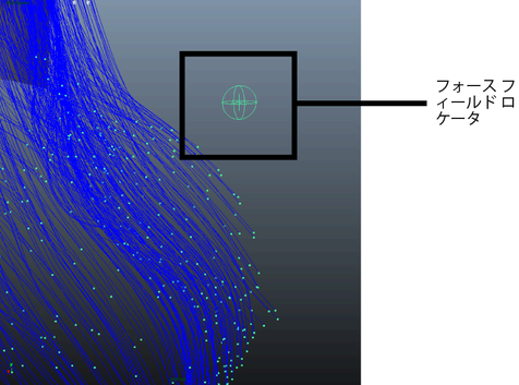 選択されたヘア カーブの近くにフォース フィールド(Force Field)ロケータが表示され、に../../Maya-Tech-Docs/Nodes/dynamicConstraint.htmldynamicConstraint ノードが表示されます。