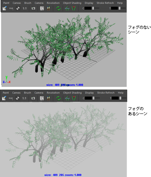 大気中の粒子のエフェクトをシミュレートするには、環境フォグを使用できます。シーン内で物理フォグ(Physical Fog)を使用する場合は、シーン ペインティング ビュー内に物理フォグを表示し、フォグをレンダーしたときのストロークの外観を確認することができます。物理フォグ(Physical Fog)の使用の詳細については、大気を参照してください。