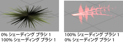 たとえば、あるブラシのシェーディングと他のブラシのシェイプをミックスする場合は、2 つのブラシのブレンド割合として、最初のブラシのシェーディングを 100%、2 番目のブラシのシェイプを 100% と指定して、新しいブラシを作成することができます。