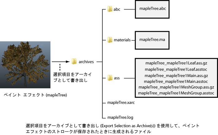 シーン内で Maya のジオメトリを保存し、それをカスタムのアーカイブ ジオメトリとして XGen で使用することができます。Maya シーンを選択して、そのシーンの中身をアーカイブ ファイルに一括書き出しすることもできます。たとえば、Maya のペイント エフェクト(Paint Effects)でツリーを作成し、次に、そのツリーのポリゴン バージョンを、XARC アーカイブ ファイルとしてそのサポート ファイルと合わせて保存することができます。