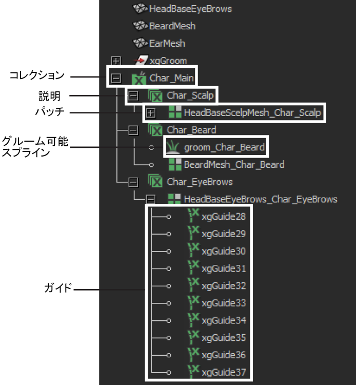 新しいディスクリプションを作成するときにシーンにコレクションがない場合、XGen が新しいコレクションを作成します。Maya は XGEN ファイルとしてコレクションを保存します。コレクション ファイルは、含まれるディスクリプションの情報を保存しています。これには、アトリビュート値、Ptex マップ ロケーション、パッチ バインドおよびガイドのフェース ID、レンダー設定などが含まれます。コレクションは、XGen 階層で最上位の要素です。その内容は次のとおりです。