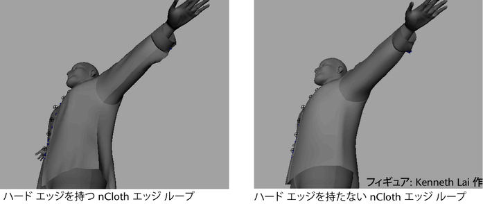 硬化したエッジ ループが、nCloth オブジェクト上で継ぎ目または折り目に似た稜線になります。この稜線は nCloth のシミュレーション時にシェイプを保持します。