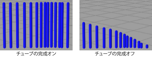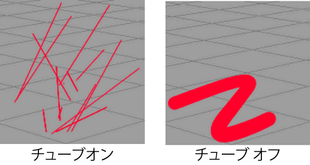 チューブ(Tubes)をオンに設定すると、ストロークのパスに沿ってチューブが植え付けられます。作成(Creation)や成長(Growth)など、チューブ(Tubes)サブセクションの設定を使用する場合は、このオプションをオンにする必要があります。チューブ(Tubes)がオフである場合は、ストロークのパスに沿ってペイントが適用され、シンプル ストロークが作成されます。