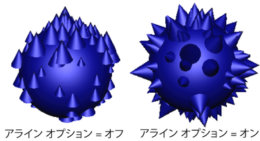 U グリッド サイズ(U Grid Size)フィールドと V グリッド サイズ(V Grid Size)フィールド内で設定したグリッドに基づいてオブジェクトを配置する場合は、グリッド(Grid)オプションをオンに設定します。グリッド(Grid)オプションがオフである場合は、頂点の位置に基づいてオブジェクトが配置されます。Maya