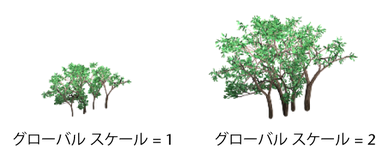 ブラシ アトリビュートの値を共通の係数によって調整する場合は、グローバル スケール(Global Scale)を設定します。このグローバル スケールによってペイント エフェクトが一様にスケールされるため、同じエフェクトを異なるサイズでペイントすることができます。