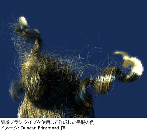 細線(ThinLine)ブラシを使用すると、多数の細いチューブをペイント(Paint)ブラシより早くレンダーできます。このブラシ タイプでは、一連のブラシ スタンプではなく、アンチエイリアシングされたラインの直接描画を利用しています。マルチストリーク(Multi Streak)方法は、細線(ThinLine)ブラシ タイプを使用しているときでも使用可能です。マルチストリーク(Multi Streak)方法と組み合わせれば、細線(ThinLine)ブラシ タイプではペイント(Paint)ブラシ タイプよりもヘアの描写が 100 倍早く、線のディテールにも優れています。さらに、マルチストリーク(Multi Streaks)を使用して、濡れたヘアの塊など、新しい外観を表現できるようになります。