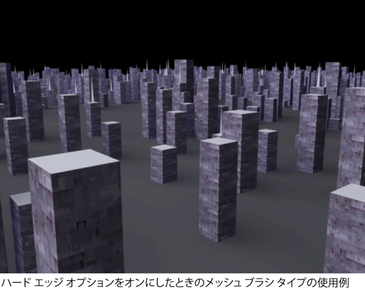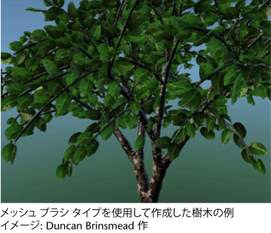 メッシュ(Mesh)のブラシ タイプ(Brush Type)を使用して、遠方から見てなるほどと思わせるだけでなく、クローズアップにも耐えるペイント エフェクト(Paint Effects)樹木と植物を作成することができます。硬質な端のジオメトリ(建物)のようなシェイプを作成することもできます。また、メッシュ(スペキュラ ハイライトを含む)にピクセルごとにライティングできます。そのほか、このブラシには組み込みの環境マップがあります。これは反射性のサーフェスをシミュレートするのに便利です(「メッシュの環境反射(Mesh Environment Reflections)ブラシ設定」を参照)。三角形のディスプレイスメントおよびバンプ マッピングを使用すると、メッシュ サーフェスの詳細を表現できます(「テクスチャリング(Texturing)ブラシ設定」を参照)。三角形はメモリに保存されず、レンダー時に生成されます。したがって、メモリ不足を心配することなく多数の三角形を使用できます。