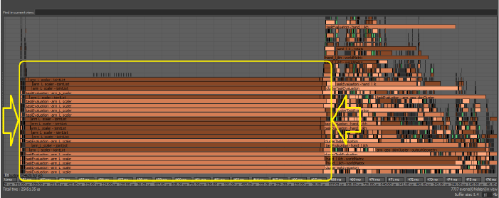 - シーン評価における並列ボトルネックの例は、評価セクションの中央のギャップに現れます。右側の大きなグループの GPU オーバーライド ブロックは、シーンの単一の部分に依存しているため、その部分が完了するまで待機する必要があります。