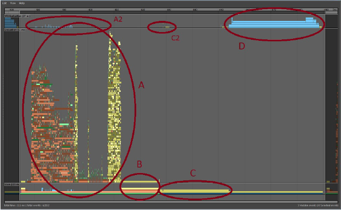 - 明るい黄色と暗い黄色の GPU オーバーライド イベントは、EM 並列評価プロファイルの長いシリアルの中央部分(EM 並列評価の 2 と 3)を置き換えました。これらの GPU オーバーライド イベントは、CPU がデータを整列化して GPU 計算を開始するのにかかる時間を表します。