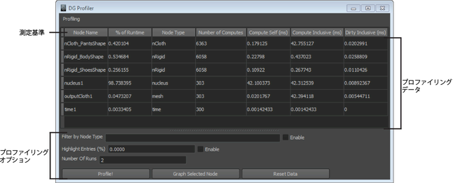 プロファイリングは、特定のプロセスを完了するのにどれくらいの時間とリソースが使用されるのかを計算するプロセスです。これは、生産性を損なうような非効率的なコードを検出するのに役立ちます。DG プロファイラ(DG Profiler)は、API を介してアクセスでき、MFnDependency ノード クラスを使用します。 これにより、処理時間がかかりすぎるノードを特定できるため、不要な呼び出しを減らしたり、あるいは別の方法でプロセスの効率性を改善できます。プロファイリングにより、シーンで作業しているときに、特定の基準で各ノードをフィルタすることもできます。DG プロファイラ(DG Profiler)は、ディペンデンシー グラフ(DG)でコピーまたは計算されるデータが使用しているメモリを計測しません。